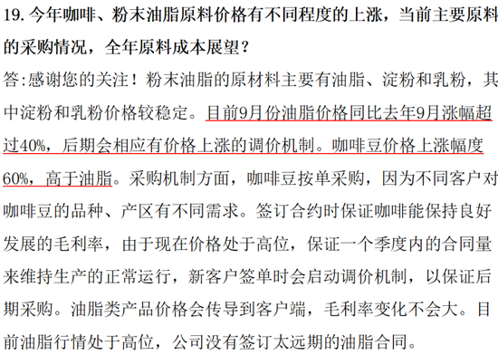 另外,今年9月份原材料油脂、咖啡豆价格涨幅较大,预计会对全年毛利率构成一定负面影响。