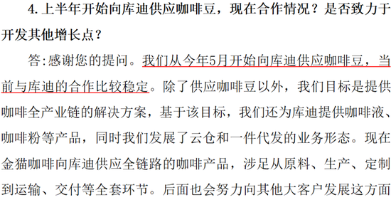 公司咖啡业务处于咖啡加工环节,主要面向B端,C端还在推进“金猫咖啡”的品牌建设。