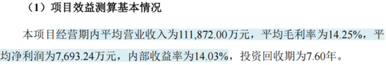 本项目预计2026年投产,参考公司的测算,预计经营期内平均营业收入为11.2亿元,约为2023年营收规模的40%。