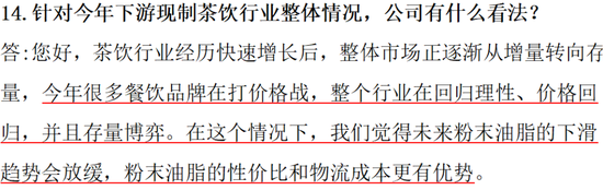 虽然公司表示粉末油脂的性价比和物流成本更有优势,未来粉末油脂的下滑趋势会放缓。